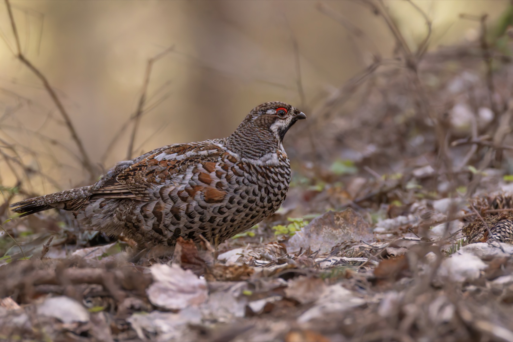 Хорошо снятый рябчик — композиция устойчива, фокус на птице чёткий, фон мягко размыт, что подчёркивает детали оперения. Цвета естественные, свет умеренный, не переборщено с контрастом. Видно, что снимок сделан в естественной среде, на земле среди опавших листьев — это добавляет реалистичности.