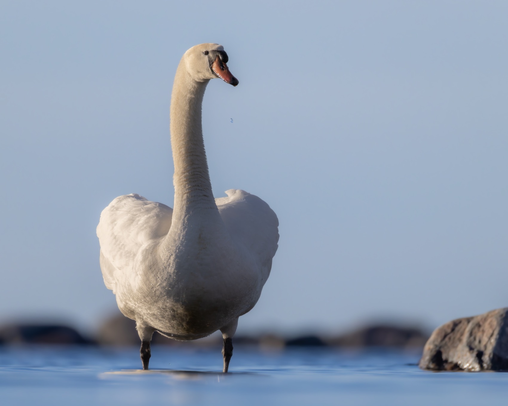 Лебедь-шипун на мелководье, фон — спокойная гладь и небо. Чёткая композиция, естественный свет. 🦢