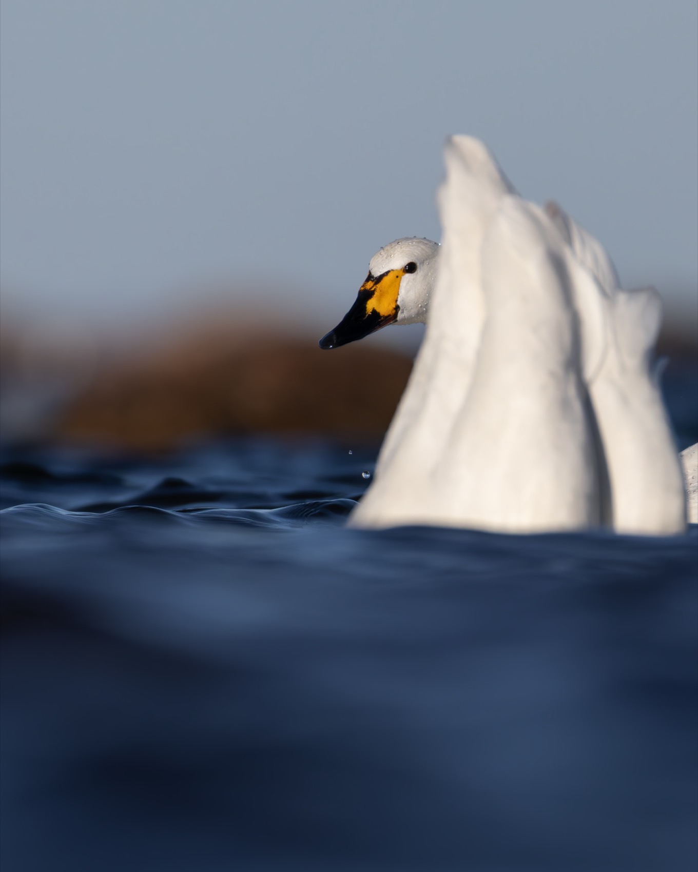 Свет мягкий, композиция акцентирует линию шеи и контраст белого оперения с тёмной водой — лебедь выделяется, как будто вынырнул из глубины.