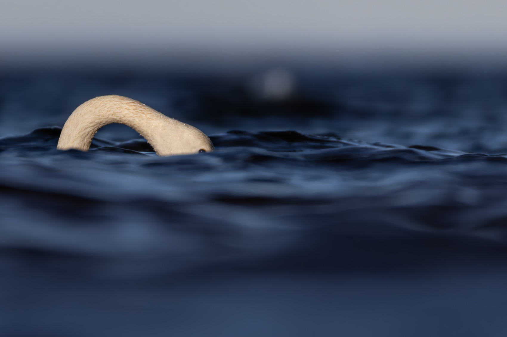 Снимок передаёт силуэт изогнутой шеи лебедя на фоне темной воды — чёткий фокус на форме, глубокая проработка боке. Хорошо уловлен момент плавания, естественное освещение. 🦩