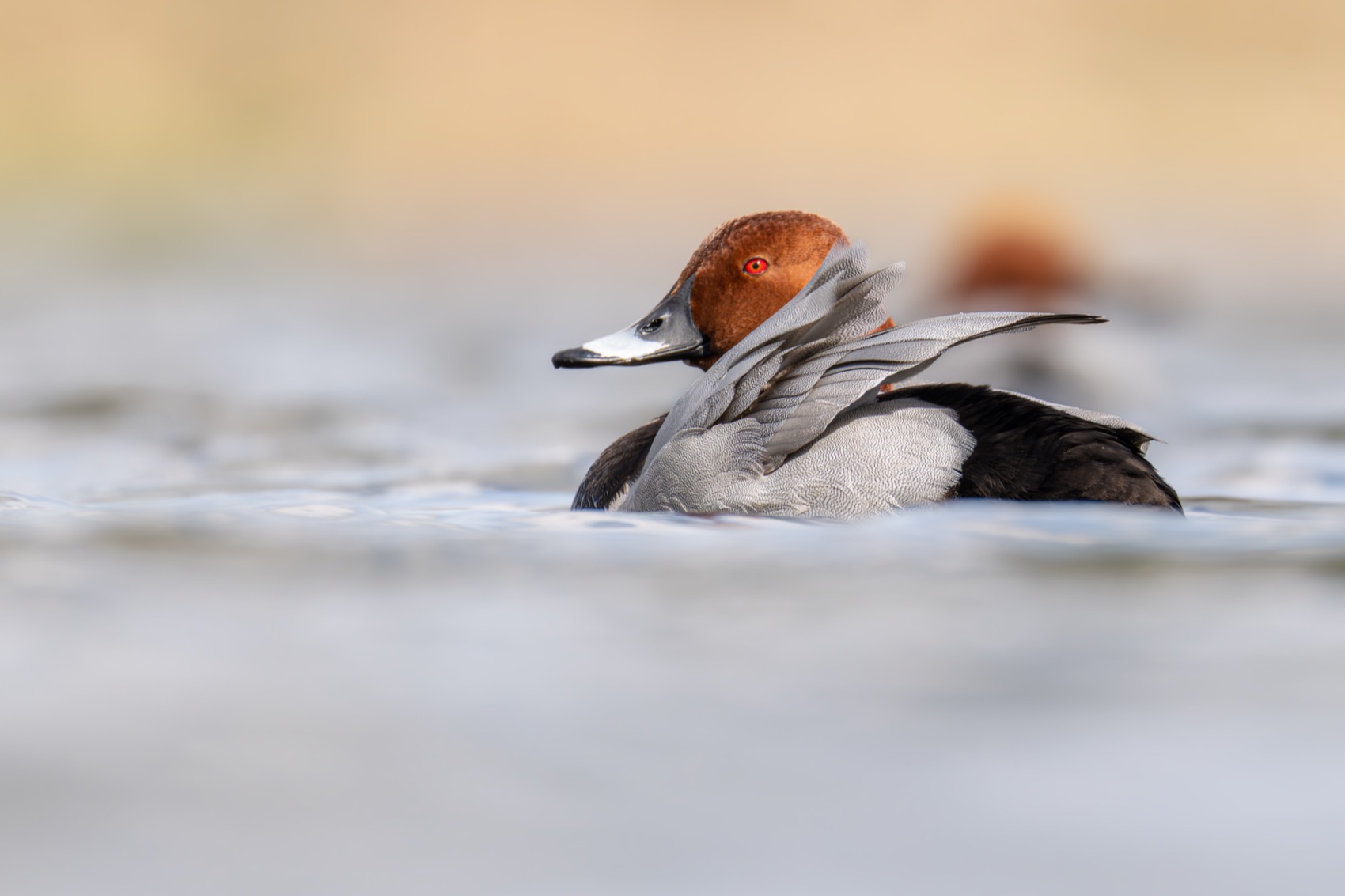 Четкая съемка, хороший фокус на птице. Фон размыт удачно — акцент на красноголовом нырке оправдан.