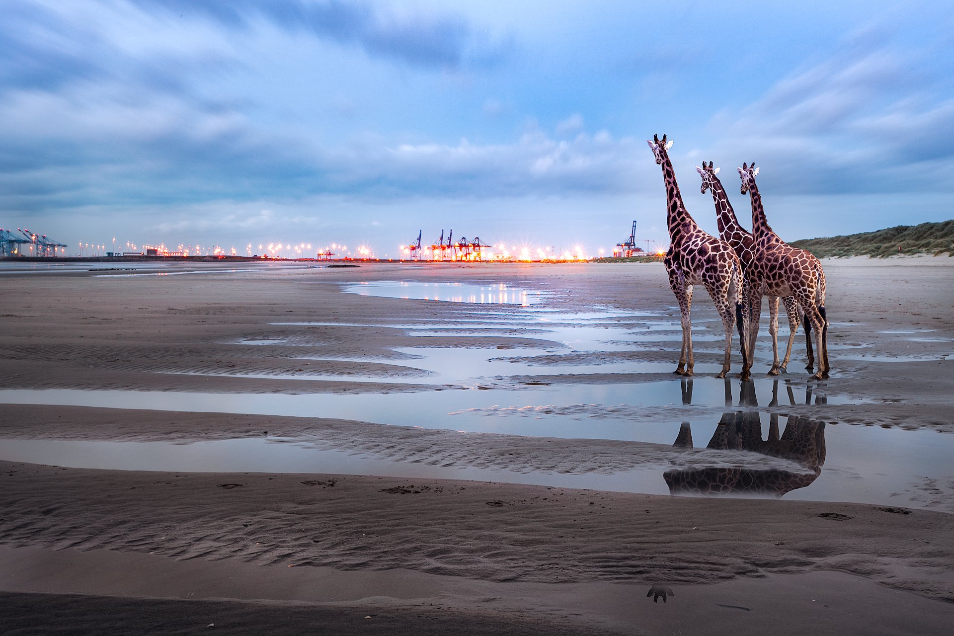 море, пляж, жирафы, подъемные краны, фонари, отражение, лужи, литораль, Андрей Огнев