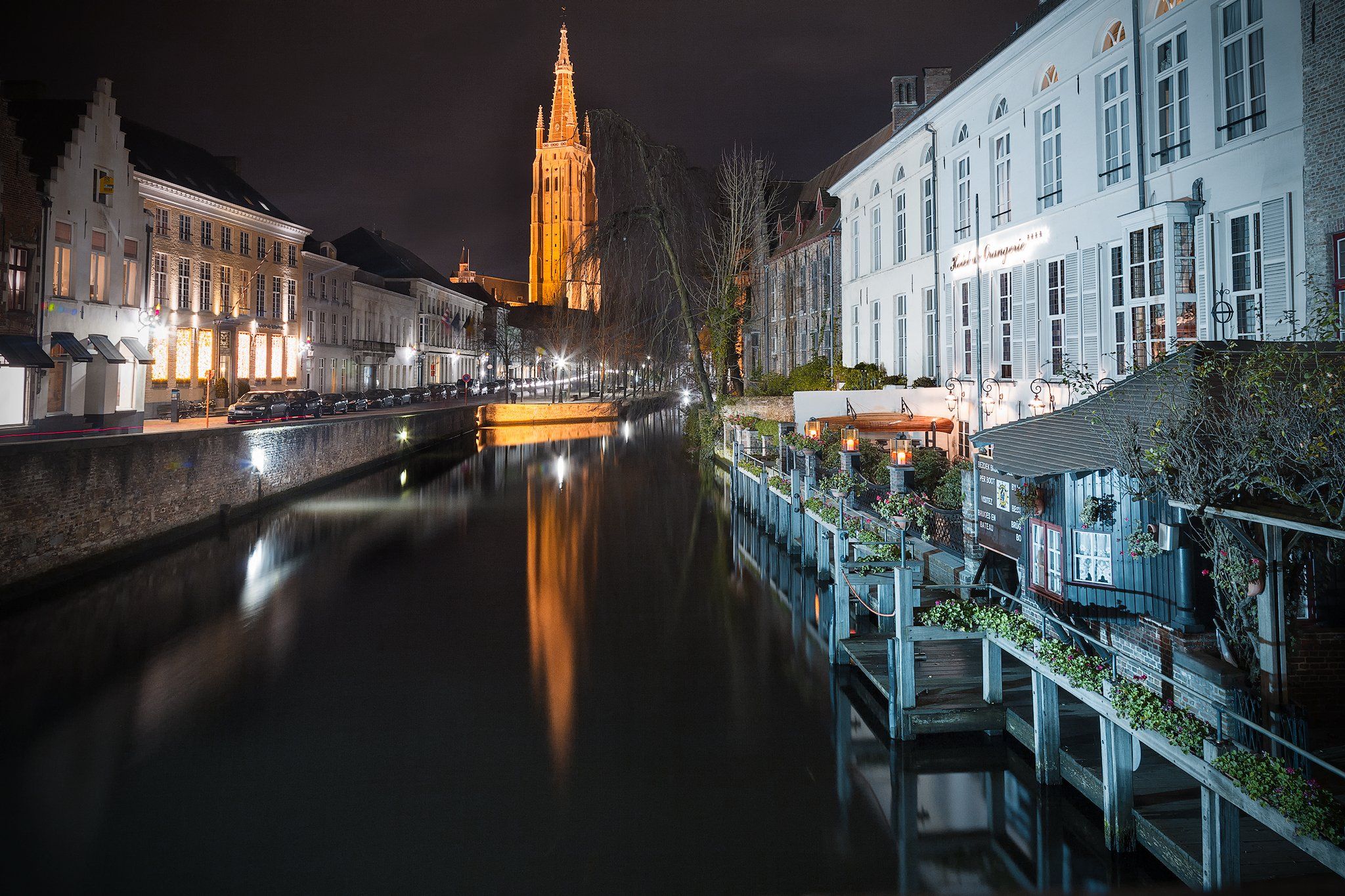 ночь, город, брюгге, канал, башня, отражение,бельгия, Андрей Огнев