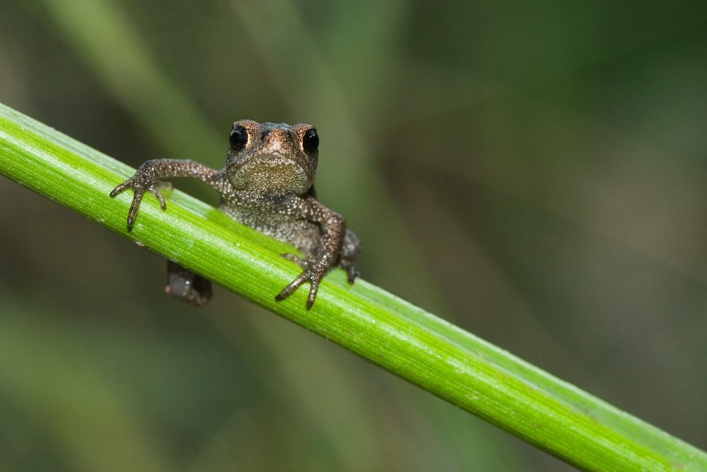 Этот чудесный лягушонок мне попался совсем случайно. Я хотел снять глаза большой лягушки, торчащие из воды, но мне так и не удалось это сделать. Но зато встретил этого чудного 2-х сантиметрового лягушонка. Он ни куда не торопился, поэтому мне удалось снять несколько кадров.