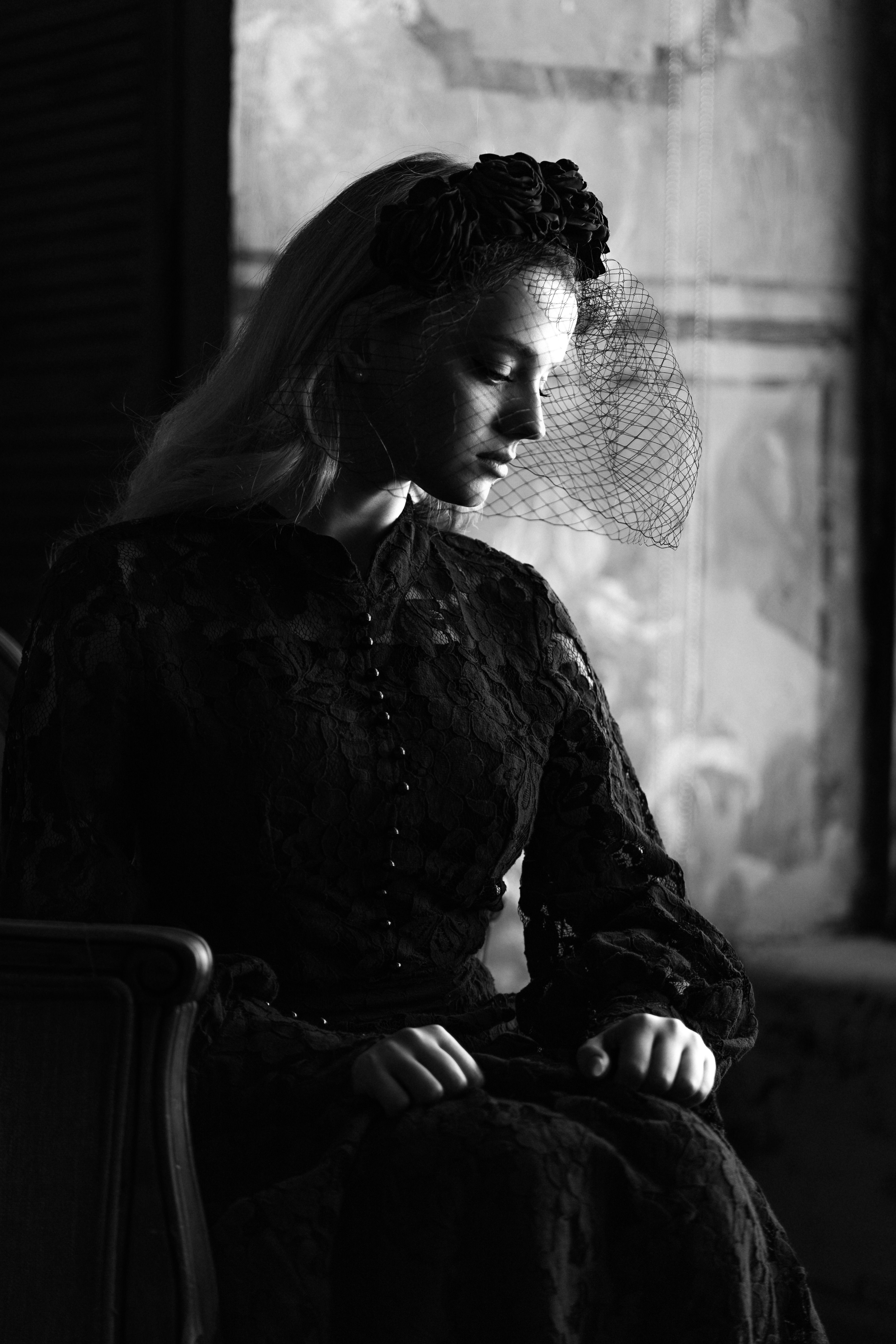 В полумраке комнаты фигура женщины кажется призрачной. Ее взгляд устремлен вдаль, словно она видит то, что скрыто от других. Черное кружево платья и вуаль добавляют образу таинственности. Момент тишины и внутренней драмы запечатлен мастерски.