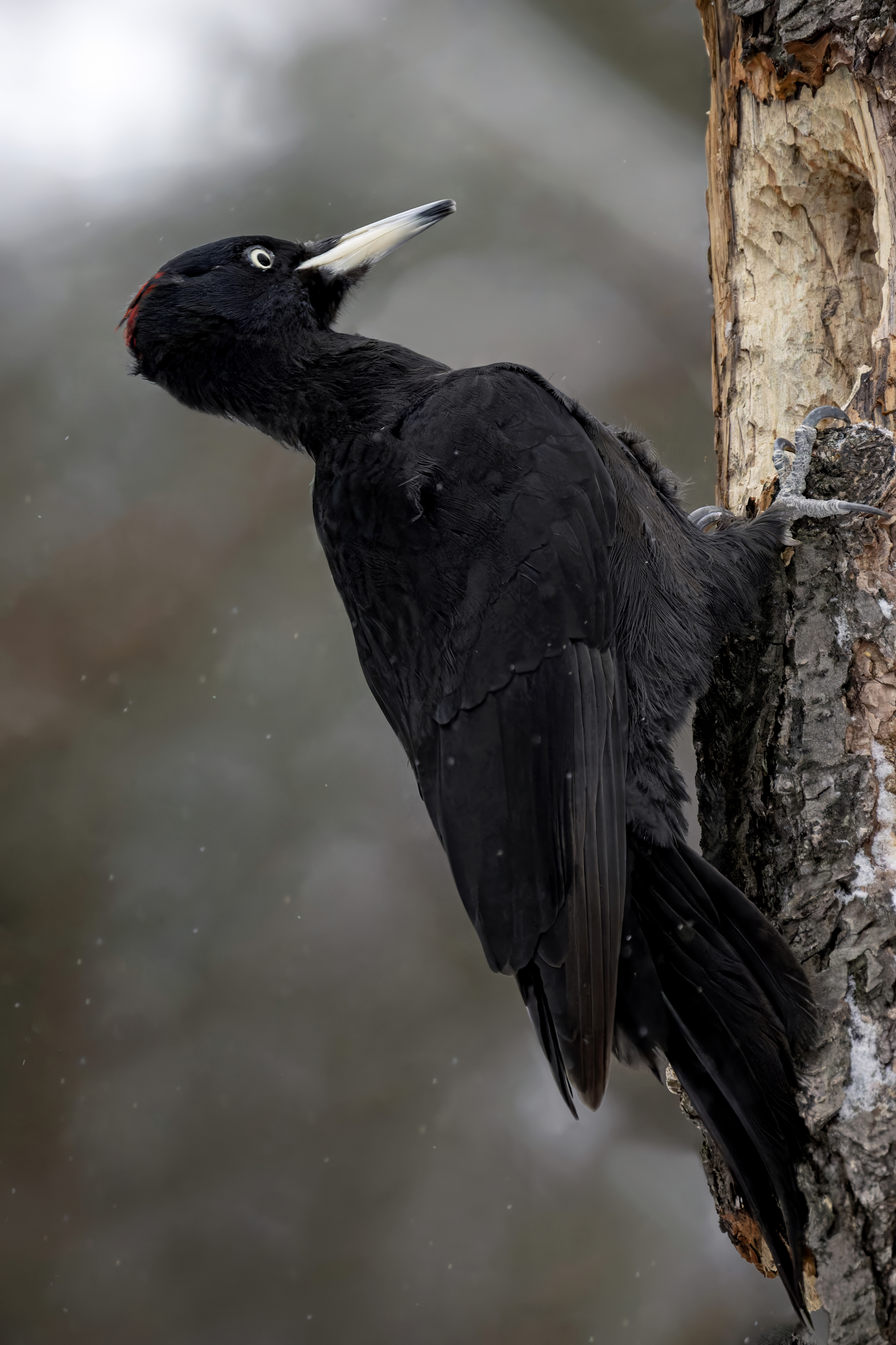 Вы хорошо передали поведение чёрного дятла в зимних условиях — позы естественны, фокус на птице чёткий, фон мягко размыт. Особенно выделяется контраст чёрного оперения с белым клювом и красным пятном на голове. Детали на коре и снегу — удачный акцент.