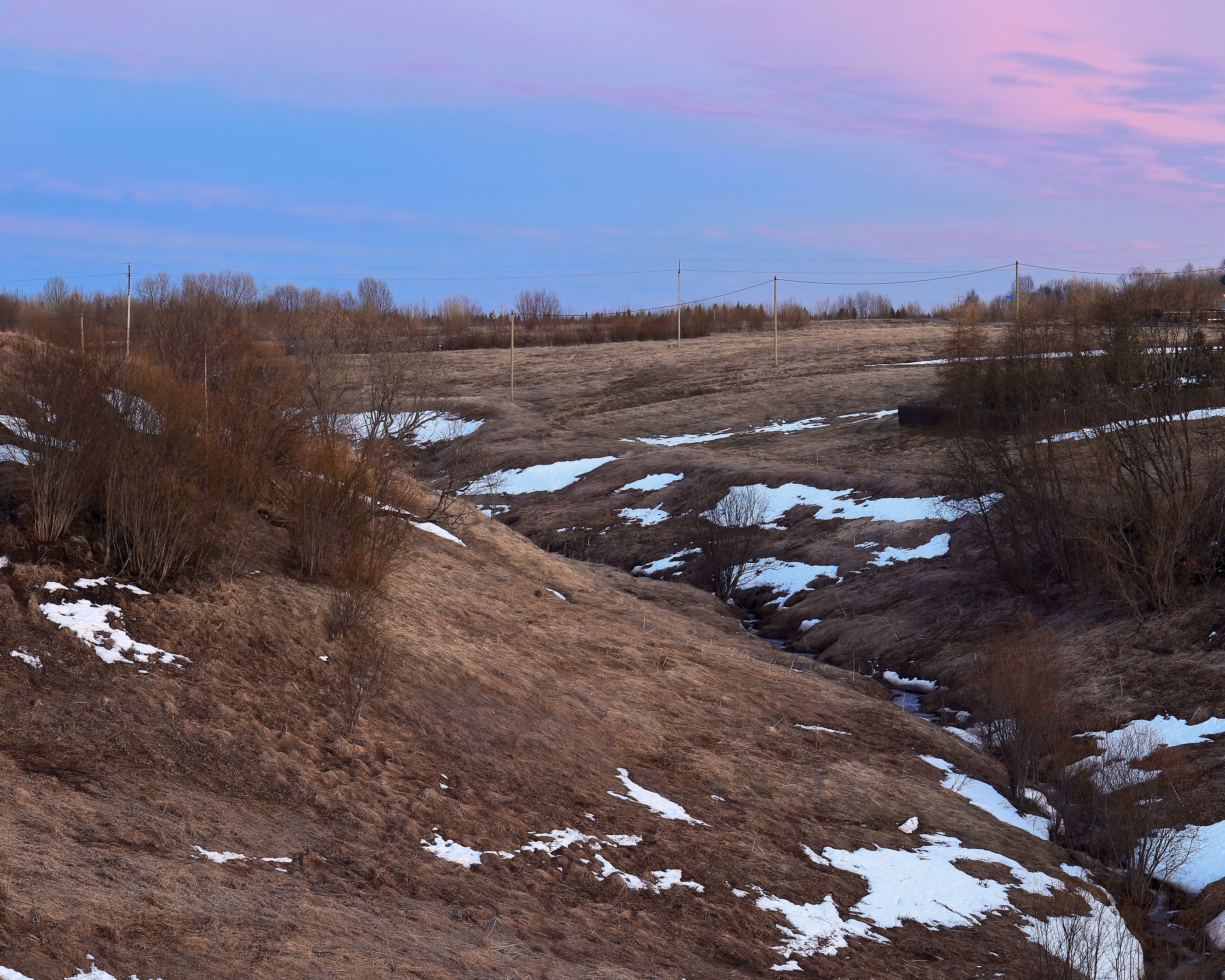 природа, весна, ручьи, овраг, вечер, небо, север, деревья, трава, холм, Титов Александр