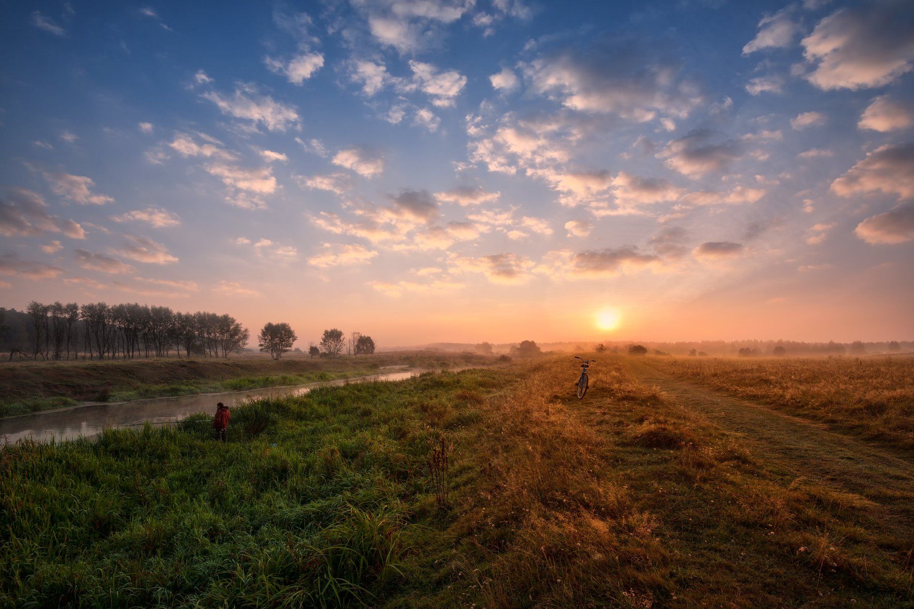 утро,рассвет,река,туман,солнце,небо,облака,рыбак,велосипед, Виталий Полуэктов
