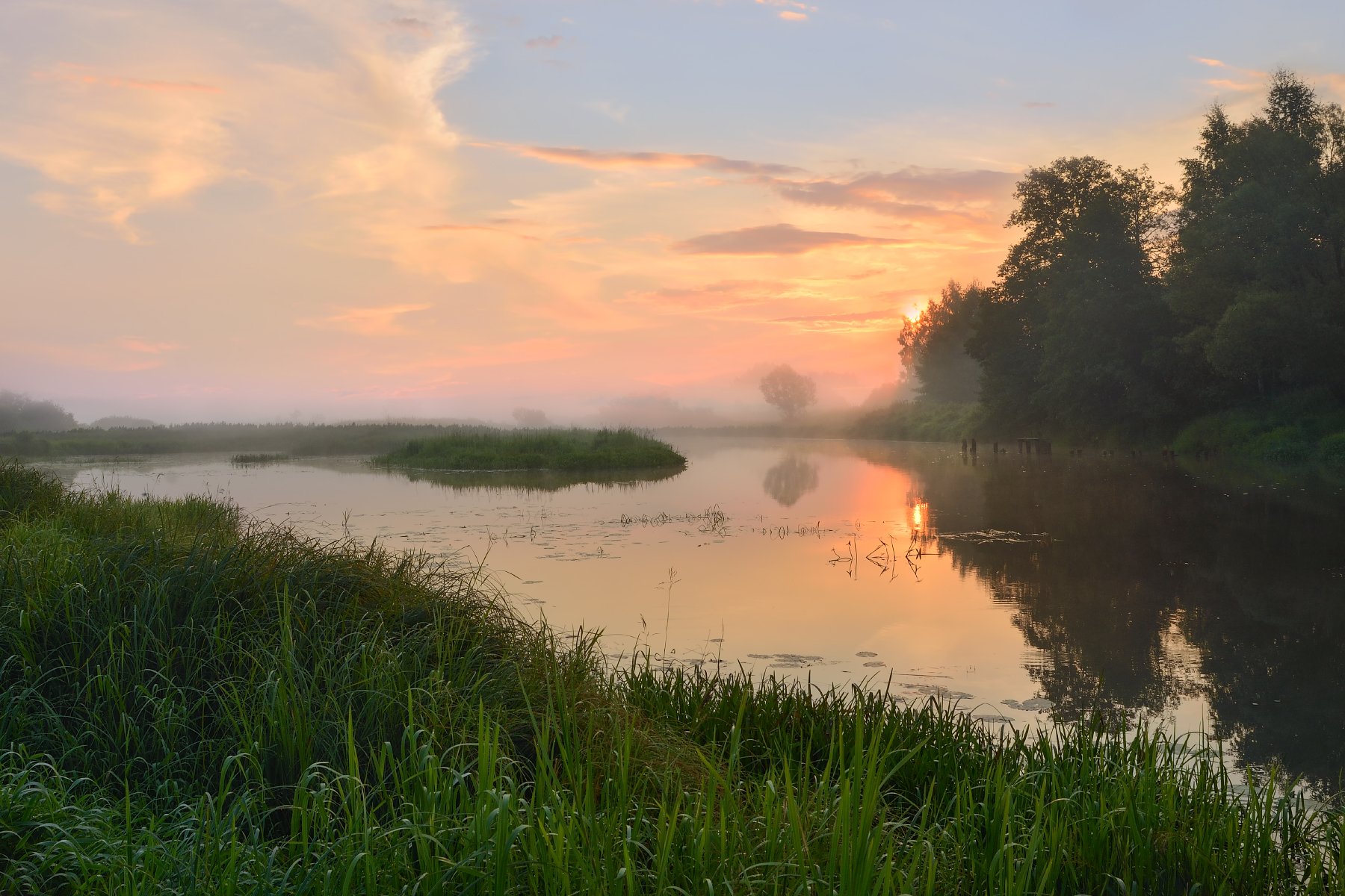 утро,рассвет,река,берег,небо,облака,туман,отражение, Виталий Полуэктов