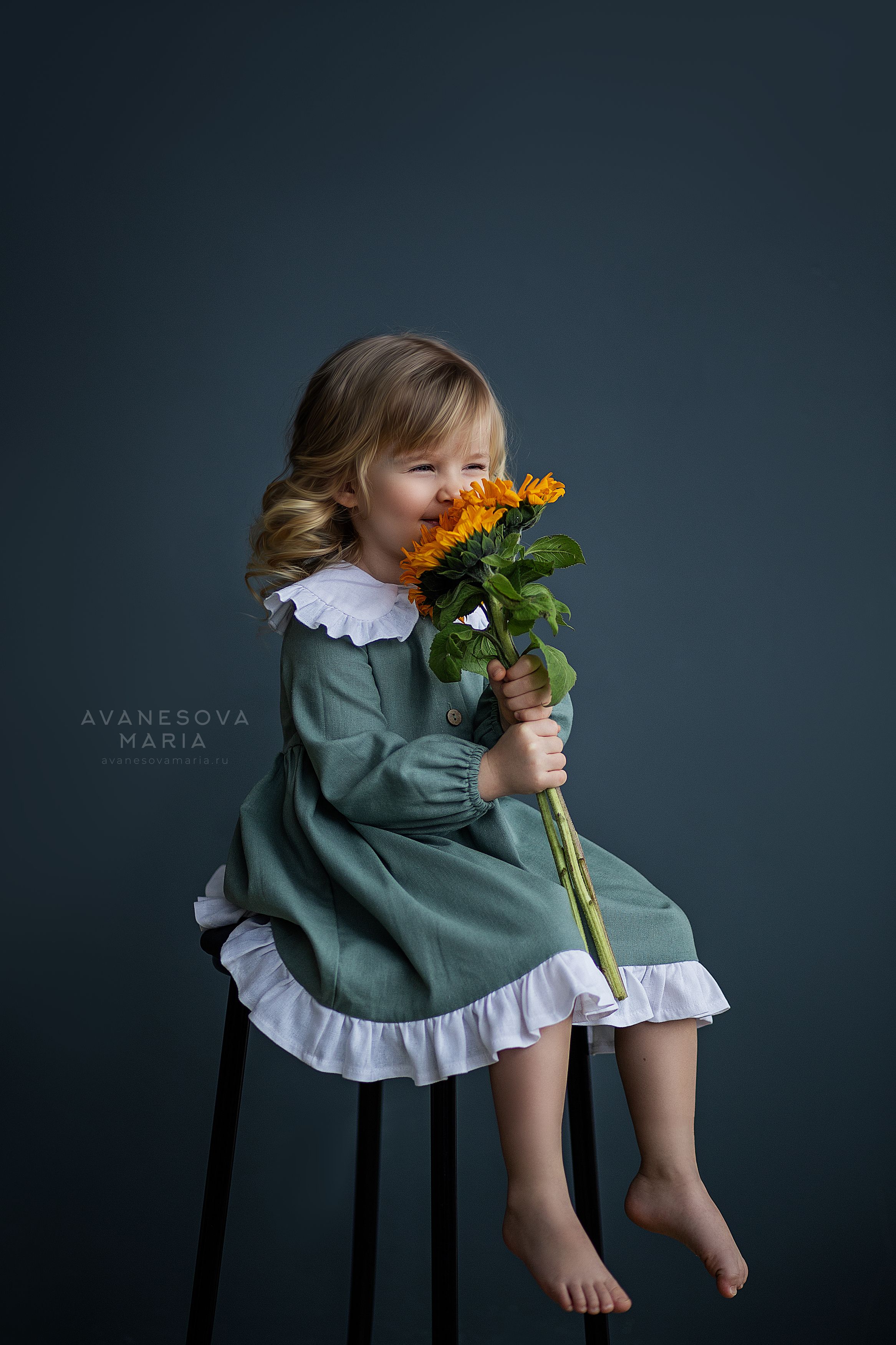 девочка, цветы, подсолнухи, студия, весна, портрет, зеленый, платье, детская фотография, ребенок, Аванесова Мария
