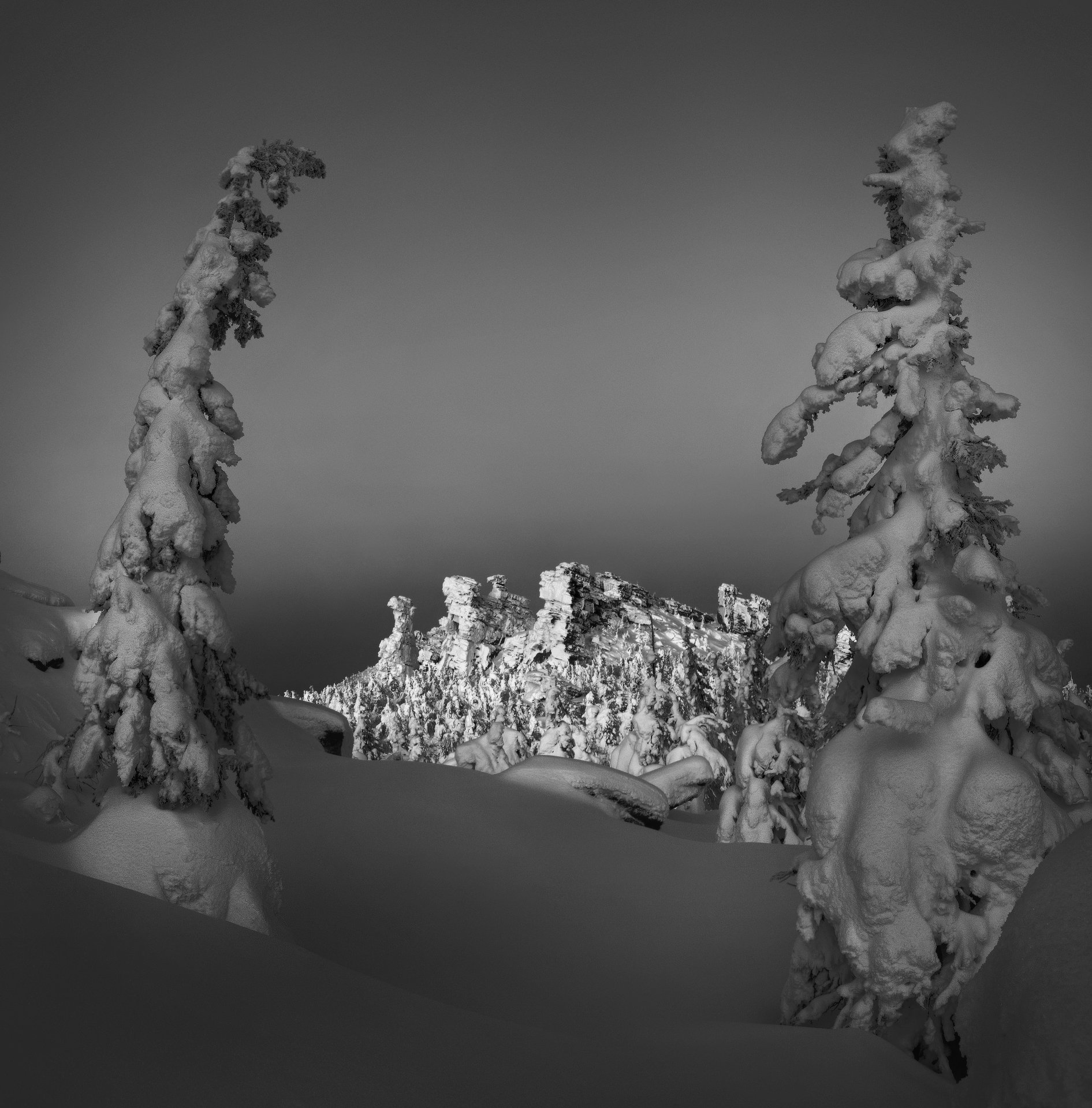 Невысоки Уральские горы, но история края тесно связана с ними, а людская память бережно хранит предания и легенды о каменных исполинах Прикамья. Один из хребтов древнего Полюдова кряжа, с множеством скал-останцев самой причудливой формы - Колчимский камень. В древние времена считалось что эта гора - обитель бога Помяна. Отсюда и второе название горы - Камень Помяненный. Северный Урал. Пермский край. г. Колчимский камень. Январь 2016 г. Панорама из 3 горизонтальных кадров.