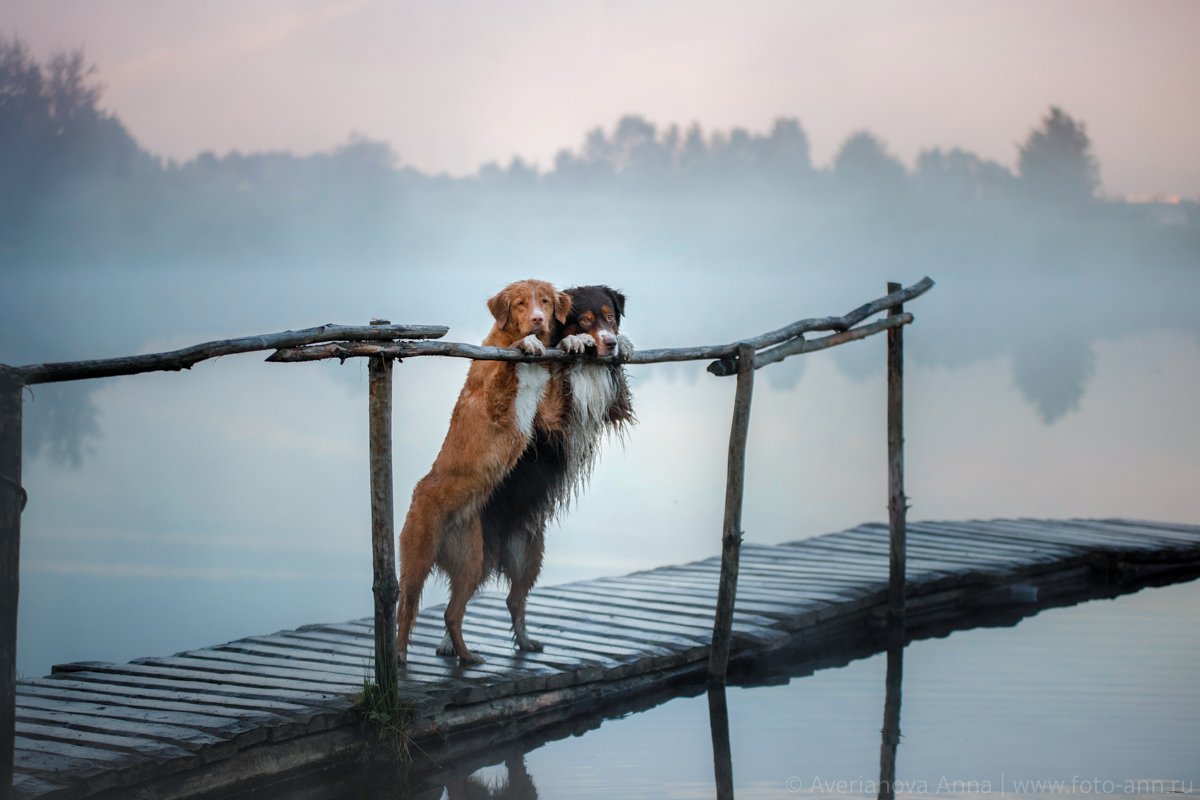 На рассвете, когда туман окутывает озеро, две собаки стоят на старом деревянном мосту. Они обнимаются, прижавшись друг к другу, словно делясь теплом и спокойствием. Отражение в воде усиливает ощущение гармонии. Фотография передаёт тихую красоту утреннего момента, где природа и животные сливаются в едином дыхании.
