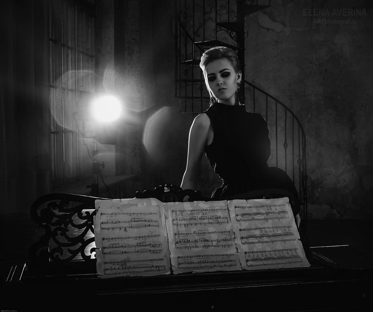 девушка, ноты, лестница, темный фон, лучи света, контровый свет, Аверина Елена