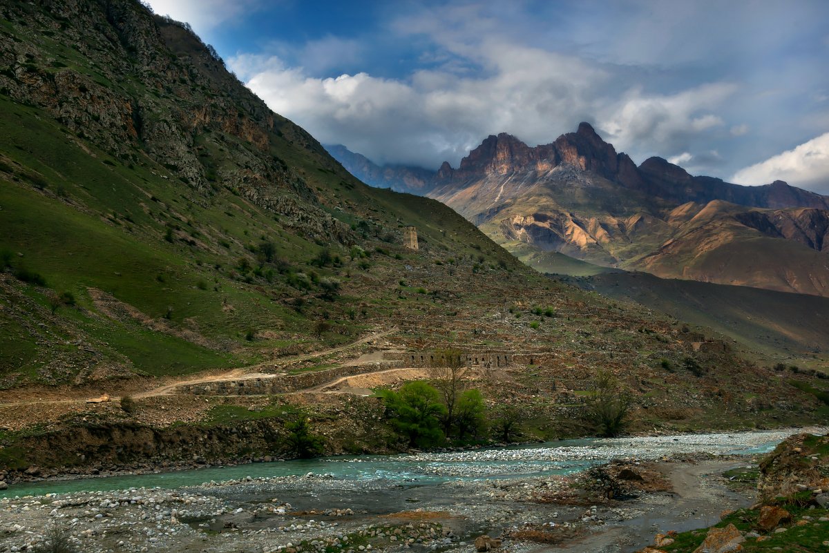 На склоне горы - сторожевая башня АбайКала(Башня Абаевых) около руин заброшенного аула Кюннюм-Эль в Верхней Балкарии (КБР). А напротив - огромный скальный уступ, напоминающий череп, который смотрит на башню. Местные рассказывают, что это дух поверженных князьями Абаевыми врагов воплотился в скале и ждет, когда они вернутся, чтобы отомстить...