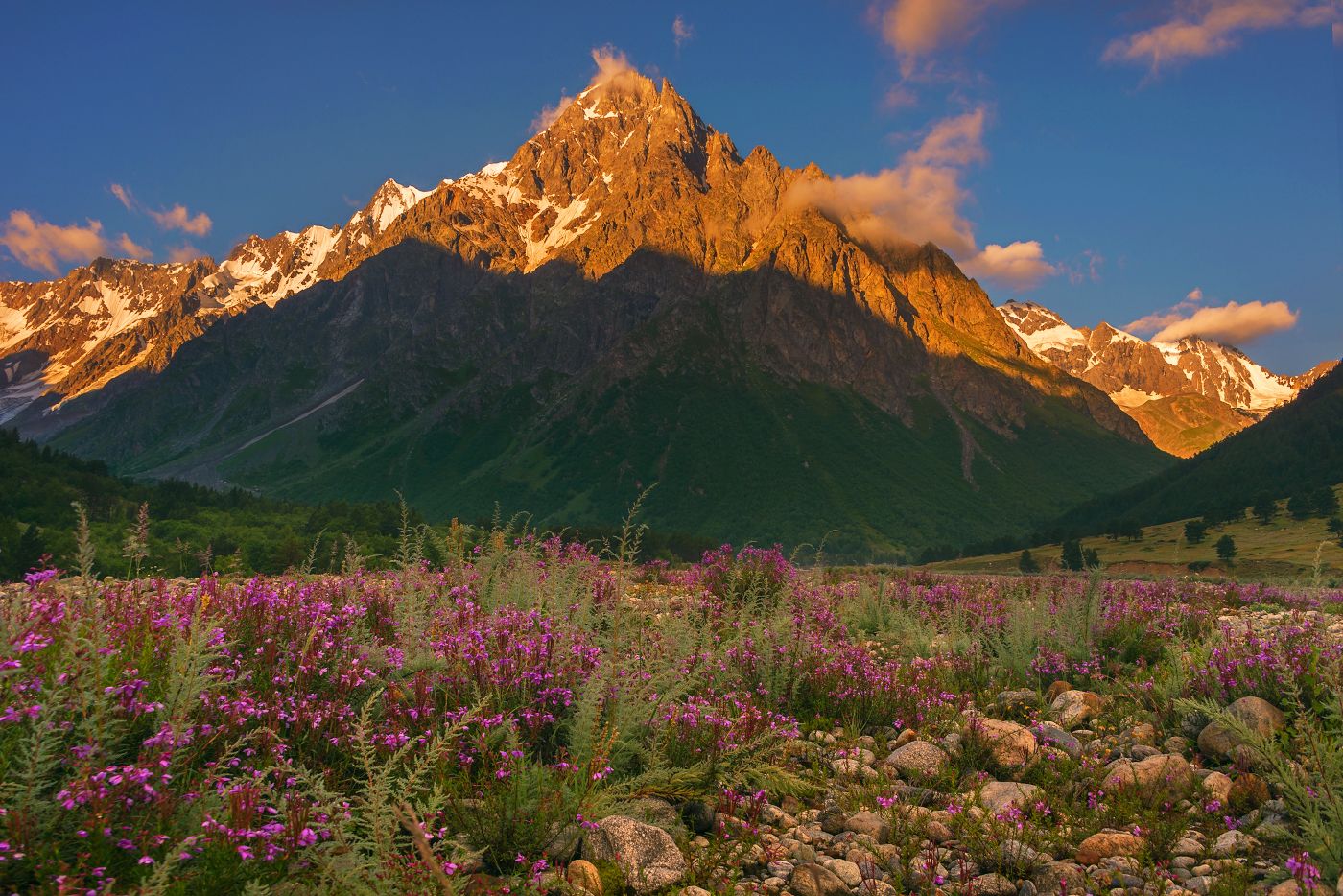 Классно, внизу сирень Иван-чая, вверху - пламенеющие вершины гор!