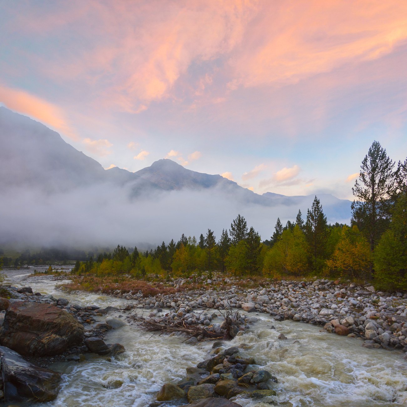 горы,река,туман,вечер,закат,сентябрь, Елена Брежицкая