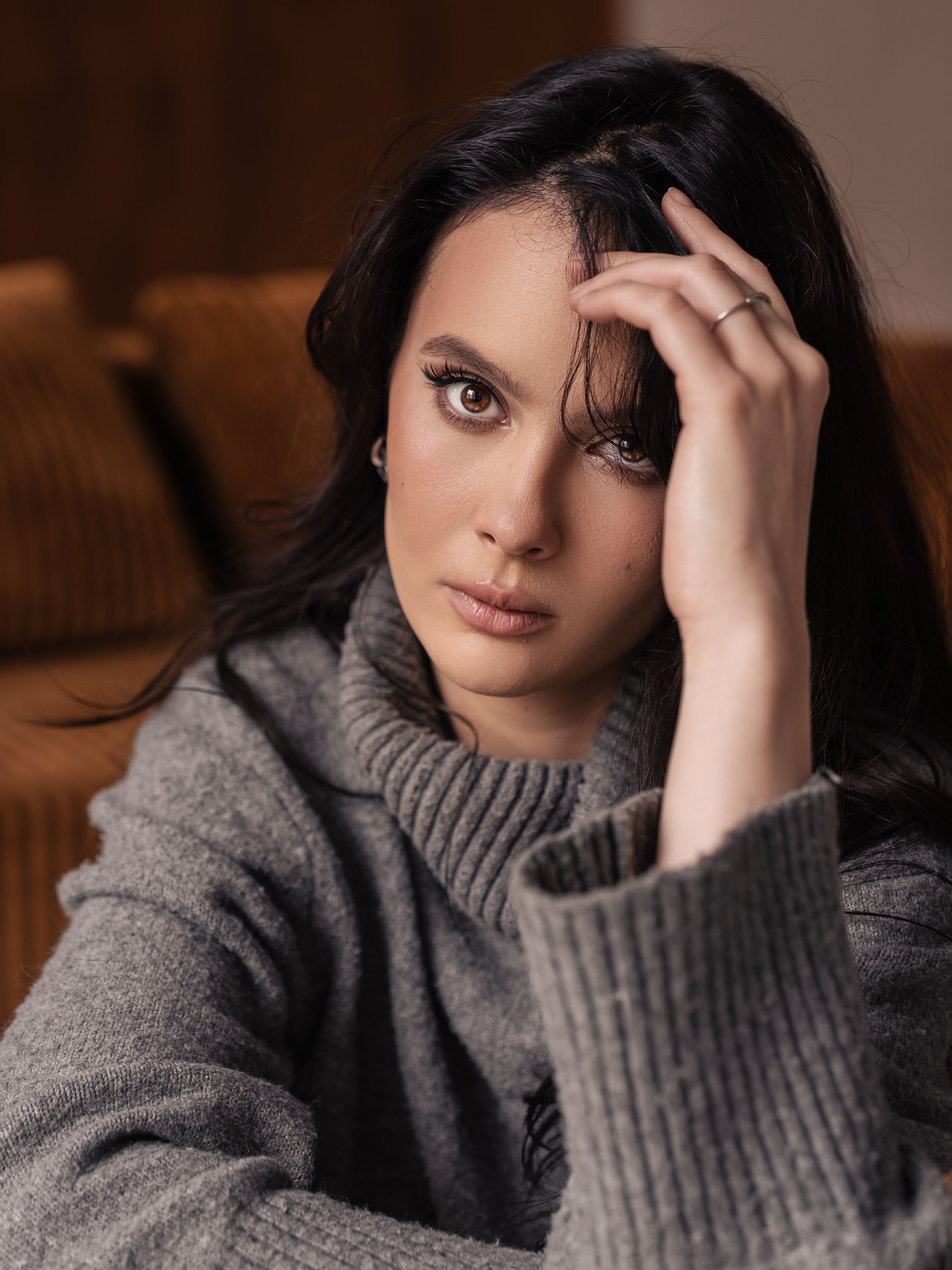 Мария — снимок с чувством. Глаза в фокусе, свет мягкий, поза естественная. Серый свитер — хорошо, не отвлекает. Тонкий жест руки — добавляет глубины. 👌