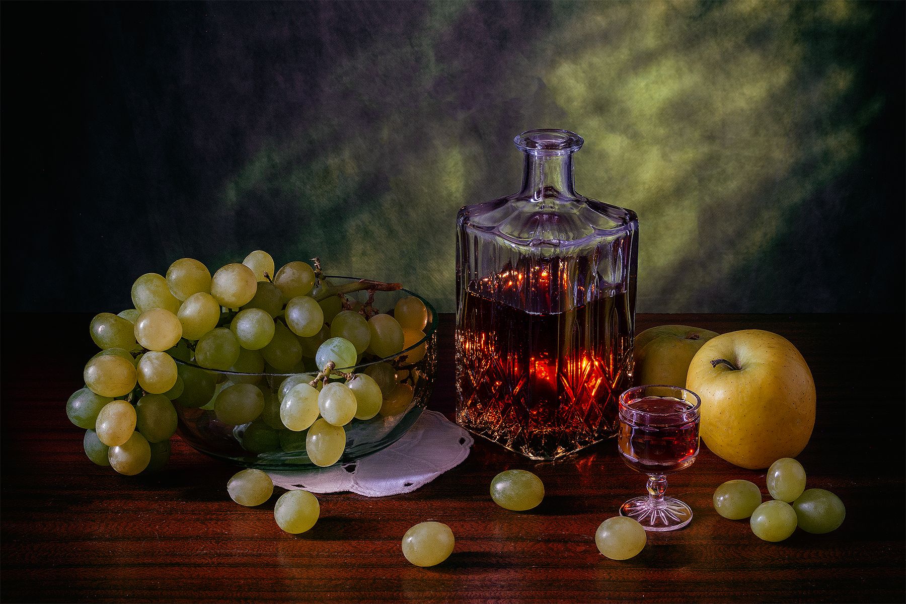 виноград, яблоки, бутылка, рюмка, вино, Баг Алексей