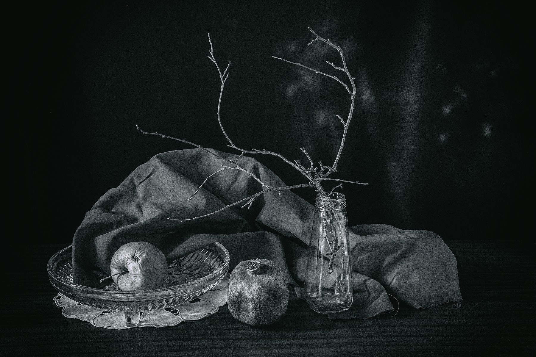 яблоко, гранат, блюдо, бутылочка, сухие ветки, драпировка, Баг Алексей