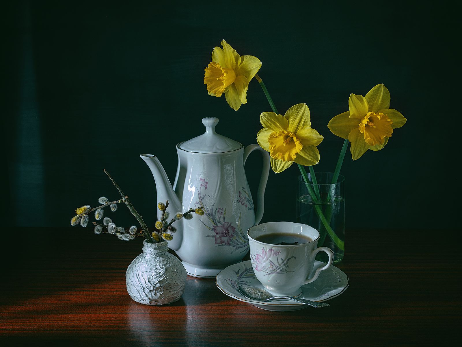 верба, нарциссы, блюдце, чашка, чайник, чай, Баг Алексей