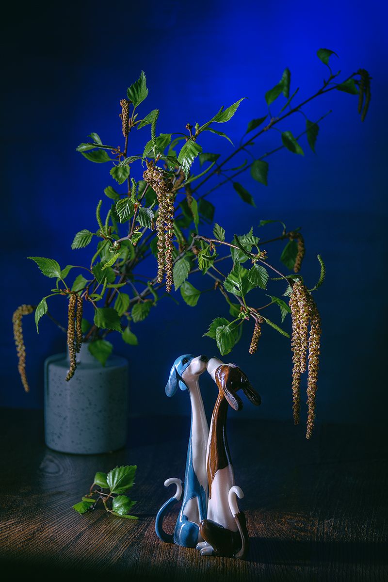 березовые ветки, березовые сережки, зеленые листья, статуэтка, собачки, поцелуй, Баг Алексей