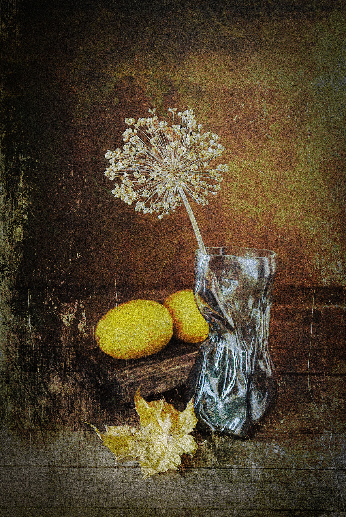 лимоны, ваза, кленовый лист, луковая шапка, Алексей Бычков