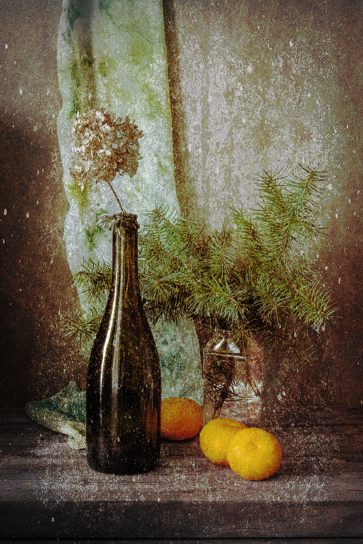 бутылка, мандарины, еловые ветки, шарф, Алексей Бычков