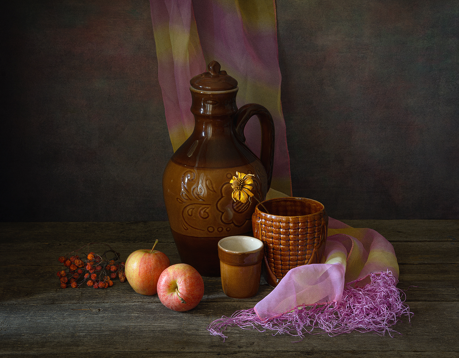 кувшин, кружка, стопка, яблоки, рябина, шарф, Алексей Бычков