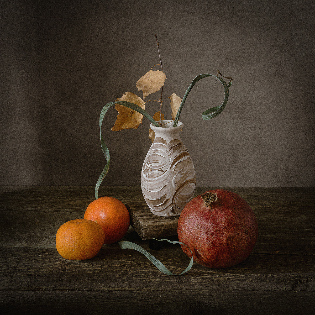 гранат, мандарины, ваза, сухая трава, листья, Алексей Бычков
