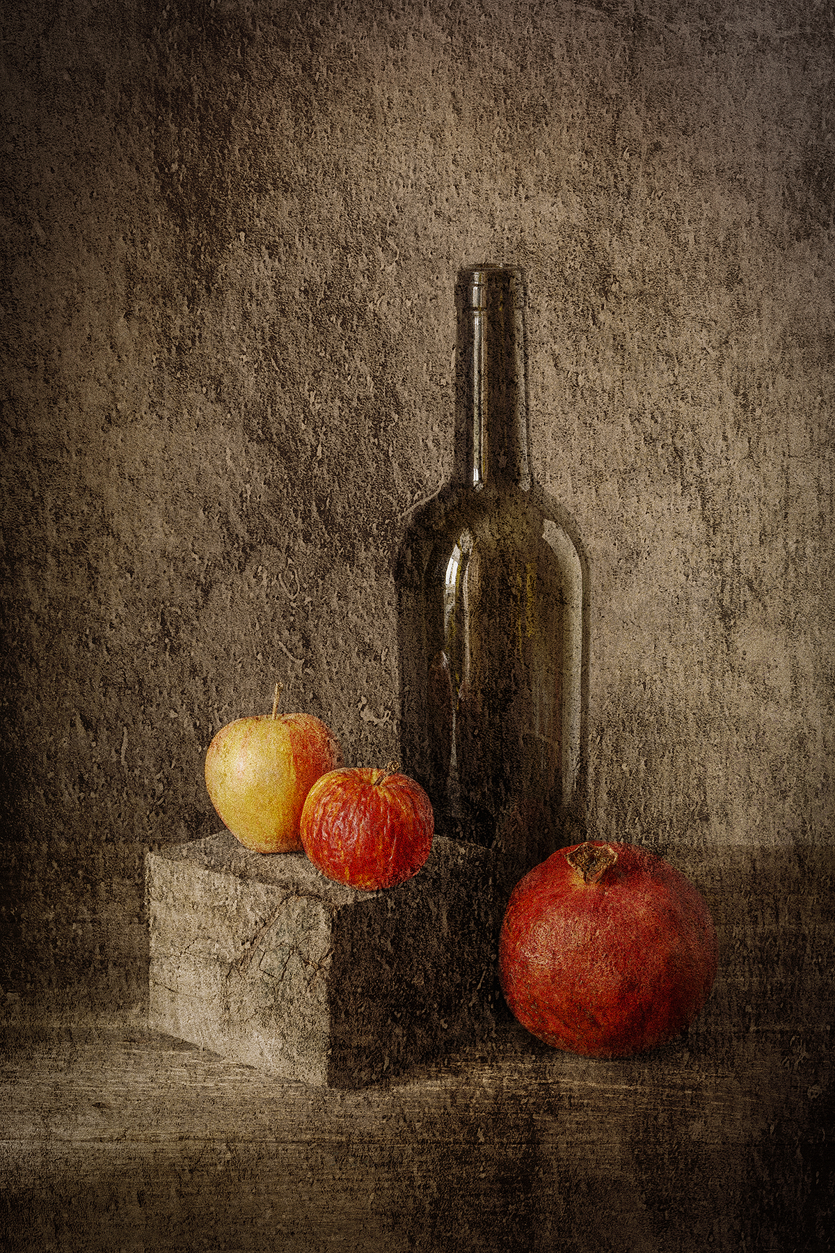 бутылка, гранат, яблоки, деревяшка, Алексей Бычков