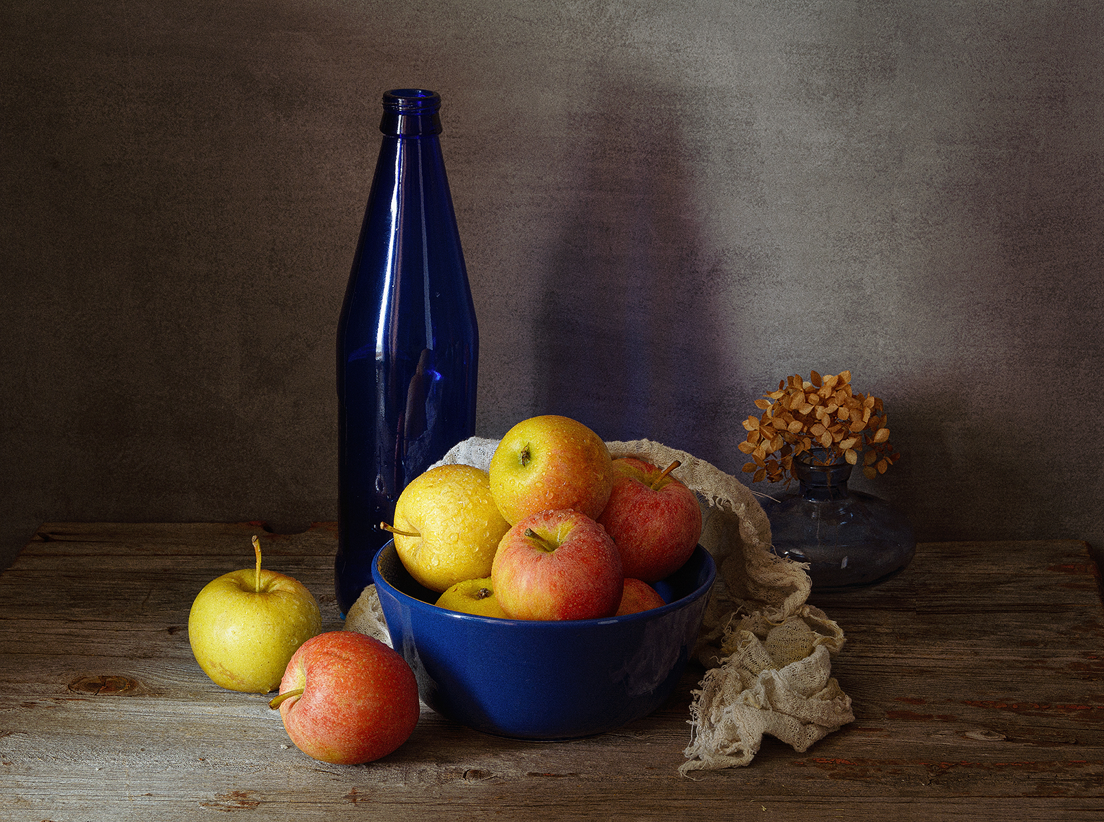 яблоки, тарелка, вазочка, бутылка, тряпка, гортензия, Алексей Бычков