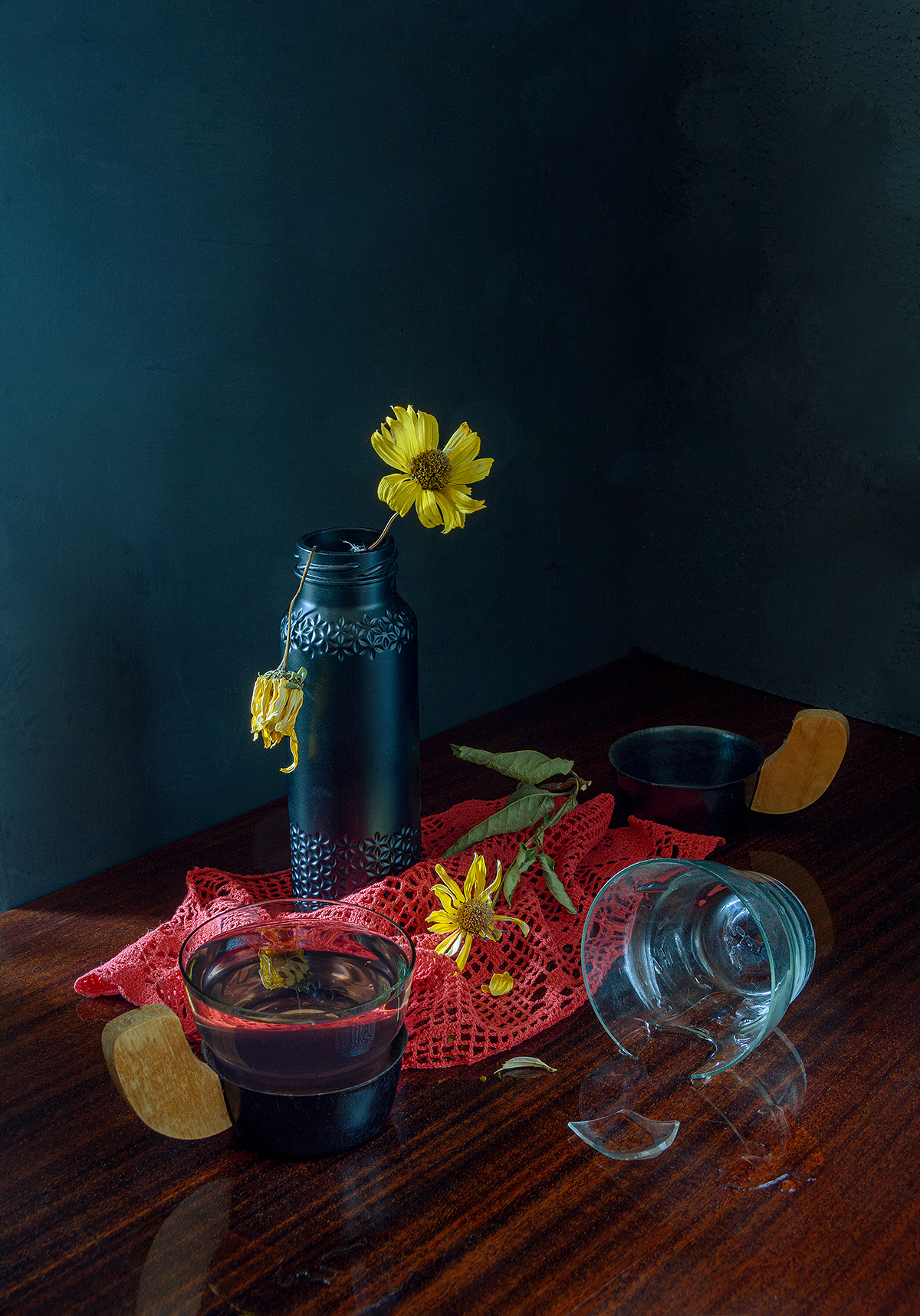 стаканы, салфетка, бутылка, сухоцветы, Алексей Бычков