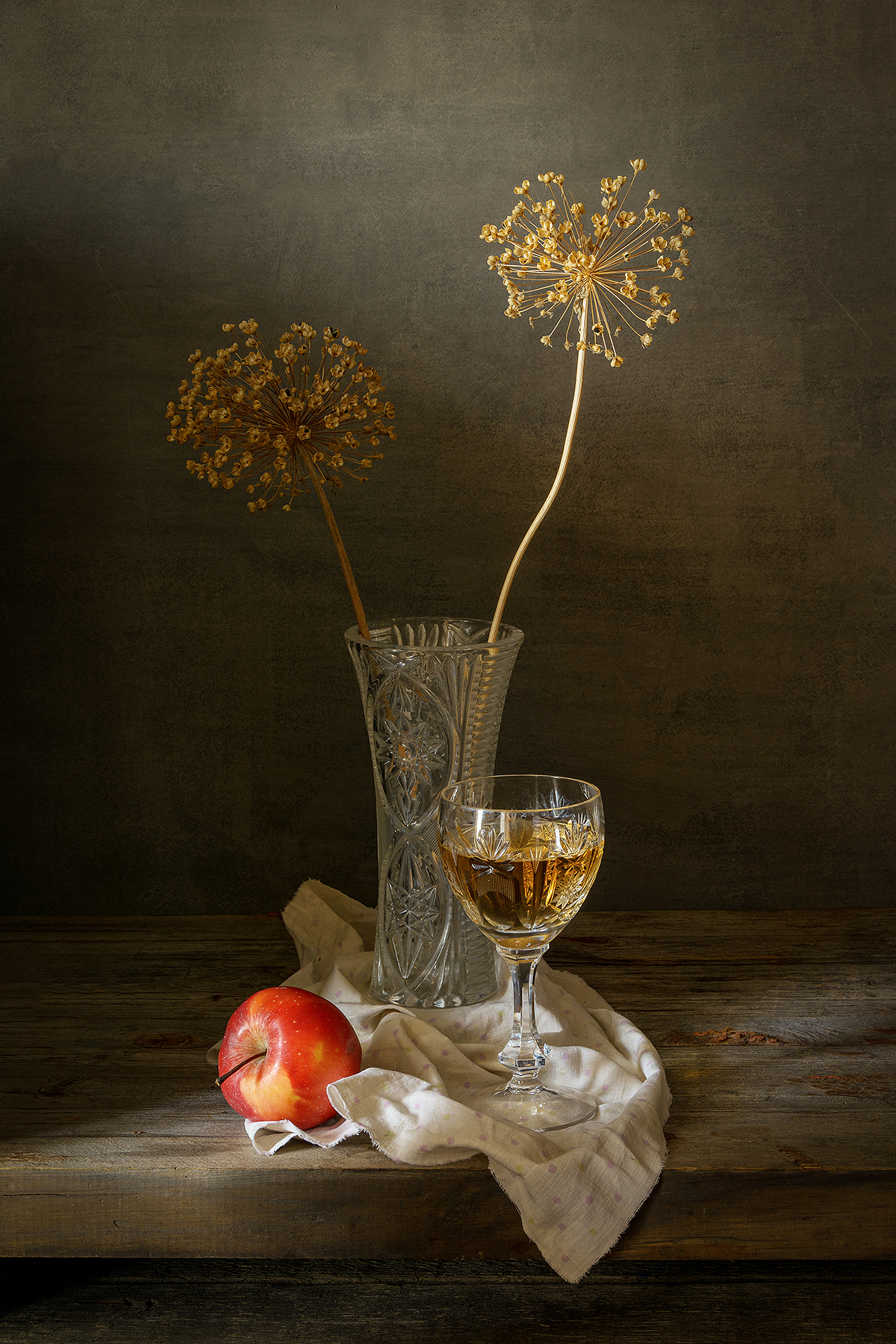 Композиция выдержана в классическом стиле — натюрморт с акцентом на текстурность предметов и мягкий свет. Яблоко, бокал и ваза создают спокойный ритм, а сухие цветы добавляют нотку ушедшего сезона. 🍎🥂🌾