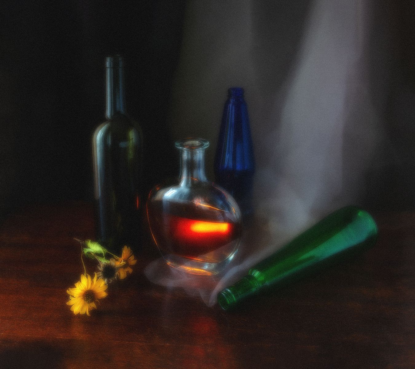 сухоцветы, статуэтка, яблоко, бутылка, Баг Алексей