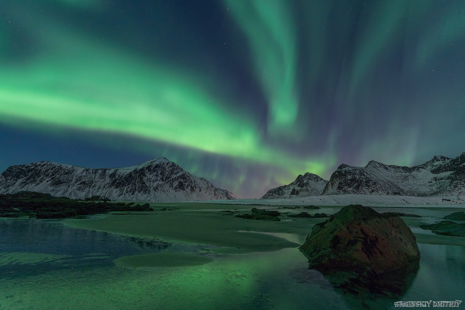 пейзаж, норвегия, полярное сияние, горы, пляж, Dmitriy  Baginskiy