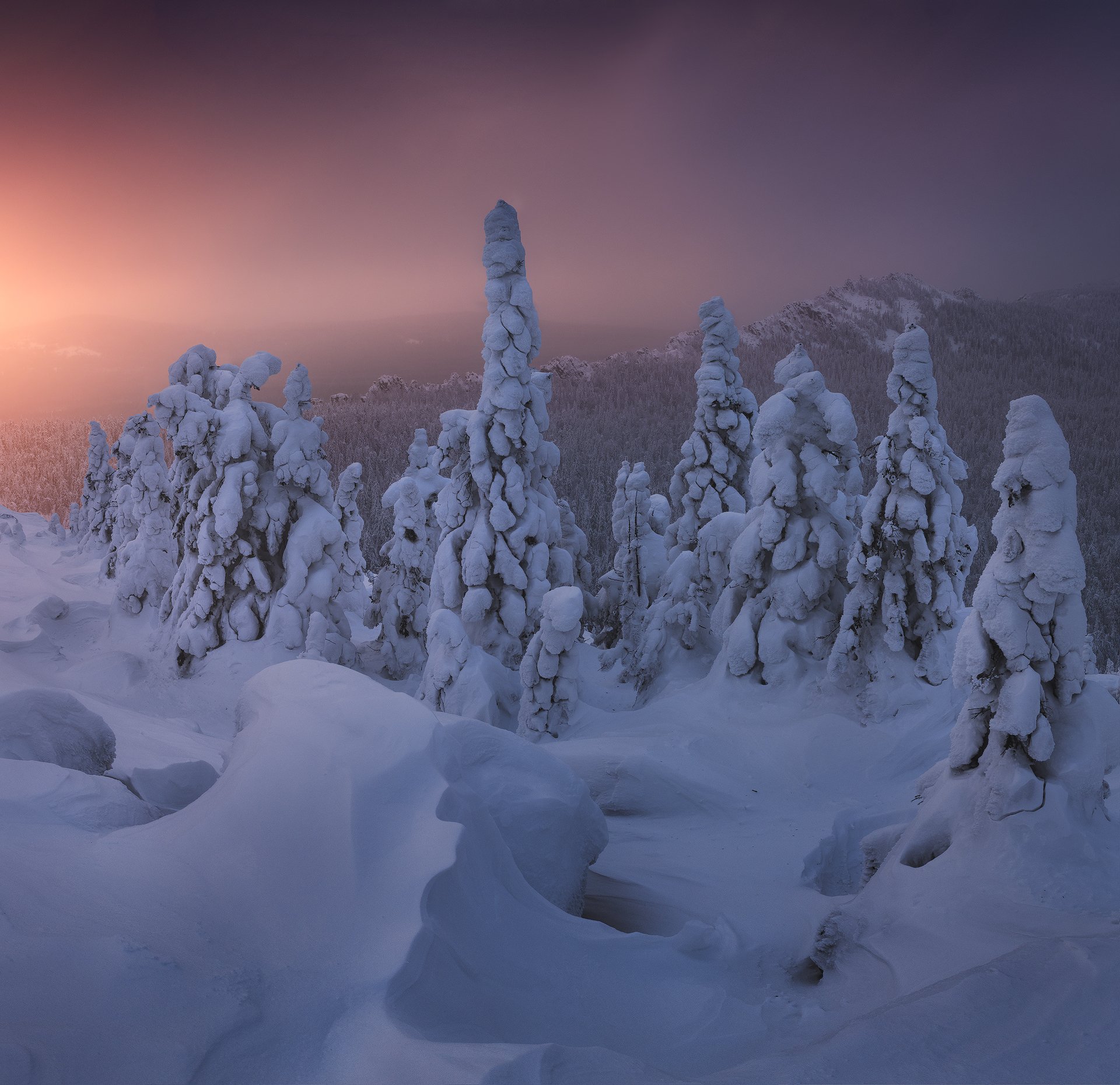 Наконец то я обработал третий кадр из своего трехнедельного путешествия по Уралу. К моему большому сожалению, теплый воздух нарушил все мои планы: снег стал таять, поднялся сильный ветер и мне так и не удалось поснимать в Пермском крае. Видимо, придется делать целый лыжный поход по этим местам следующей зимой.