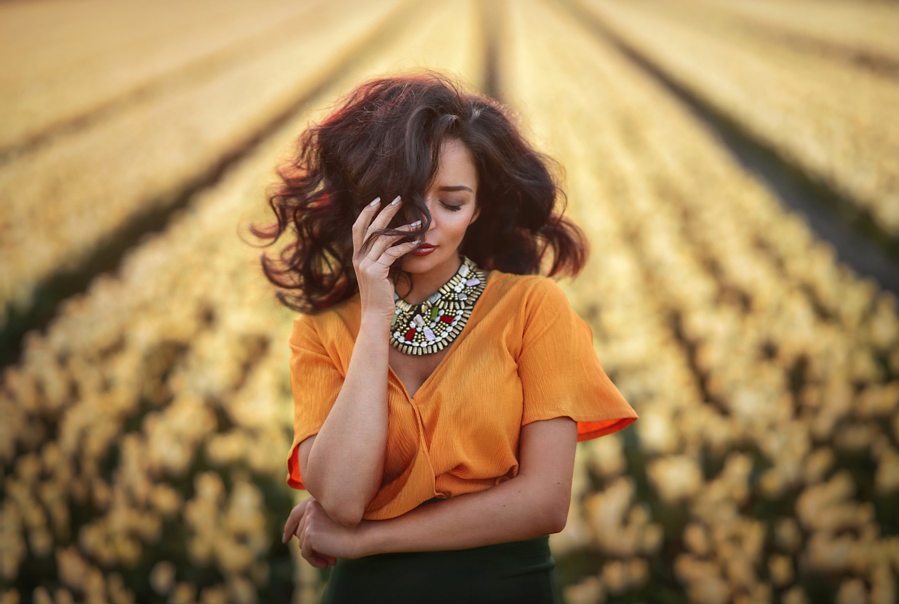 волосы.девушка,поля тюльпанов,тюльпаны,желтые тюльпаны,желтые цветы,портрет,женщина,цветы,нидерланды,поле,закат, Ilona Baimova