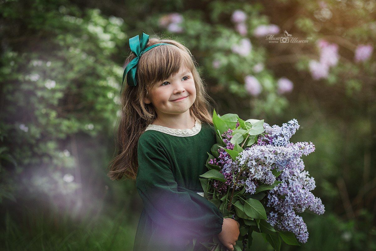 сирень, весна, букет, девочка, милая, портрет, маленькая, очаровательная, зелень, природа, сад, сиреневый, цветы, Мила Шелест