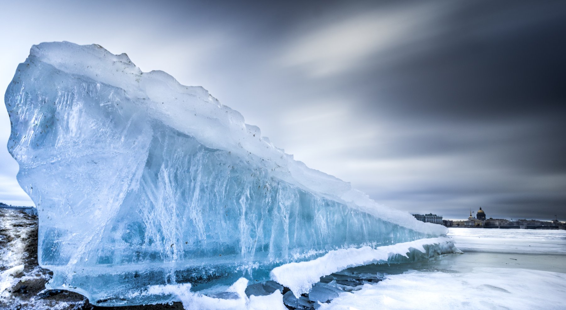 Фото с эффектным льдом уже привычно приписываешь к окрестностям Байкала, а тут Питер. Очень неожиданно и круто. Кстати, на ледышку можно медного всадника вписать)