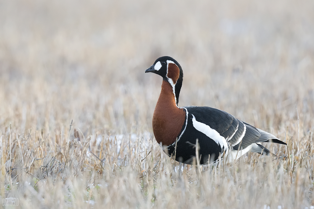Вы, Дмитрий, хорошо передали контраст оперения краснозобой казарки на фоне сухой растительности — цвета чёткие, птица чётко выделена. Интересно, какую технику съёмки Вы использовали для такого фокуса и глубины резкости?