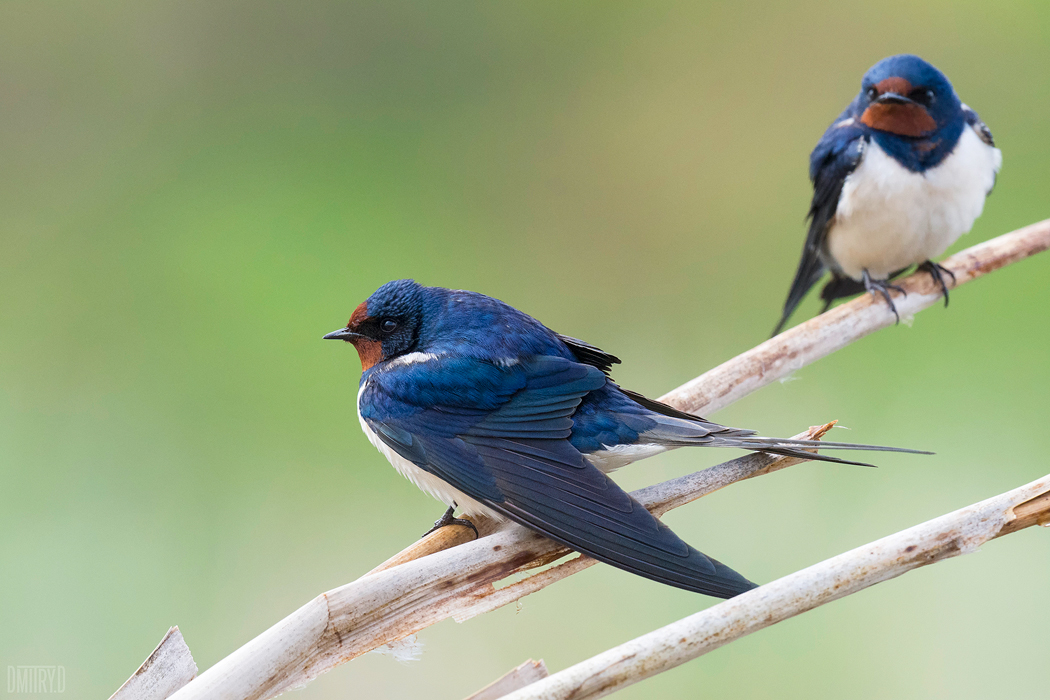 На фотографии запечатлены две ласточки, сидящие на тонкой сухой ветке. Одна птица расположена ниже и повернута в профиль, демонстрируя темное оперение спины и светлый живот. Вторая ласточка находится выше, слегка развернувшись к зрителю, что позволяет рассмотреть контраст между синевато-черной спиной и рыжеватой головой. Фон размыт, создавая мягкую зеленую подложку, которая акцентирует внимание на деталях птиц. Снимок передает атмосферу спокойствия и естественной красоты сельской местности.