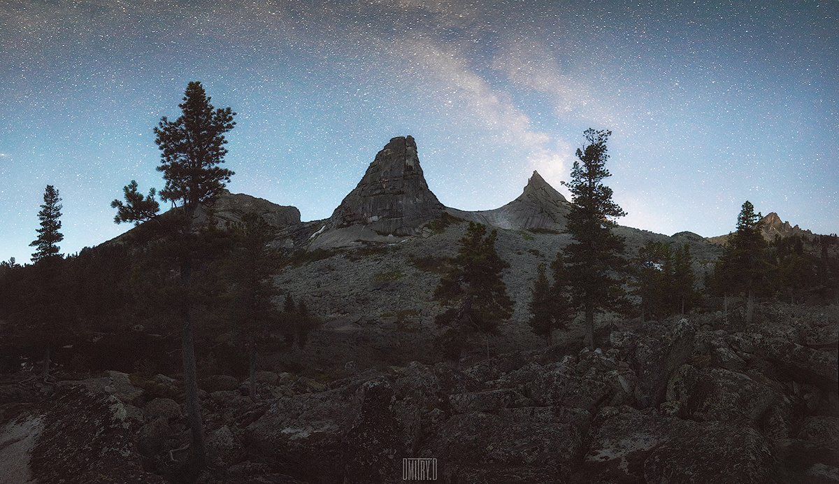 Красноярский край, природный парк Ергаки. Один из тех нескольких дней, когда на небе нет этих облаков, но и попали мы в те дни летнего солнцестояния с самыми короткими ночами. Ярко выраженного млечного пути можно и не ждать, но на фото он достаточно хорошо виден и расположен как раз над Параболой, что удобно для композиции.
