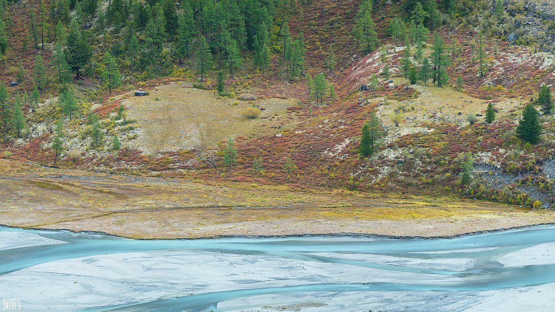 Сентябрь, осень начинает перекрашивать поверхность в такой вот разноцветный ковер. Забравшись повыше и сменив ракурс, можно увидеть и ручьи, которые текут в озеро. В итоге я получил такую вот композицию с разными природными красками. Республика Алтай.