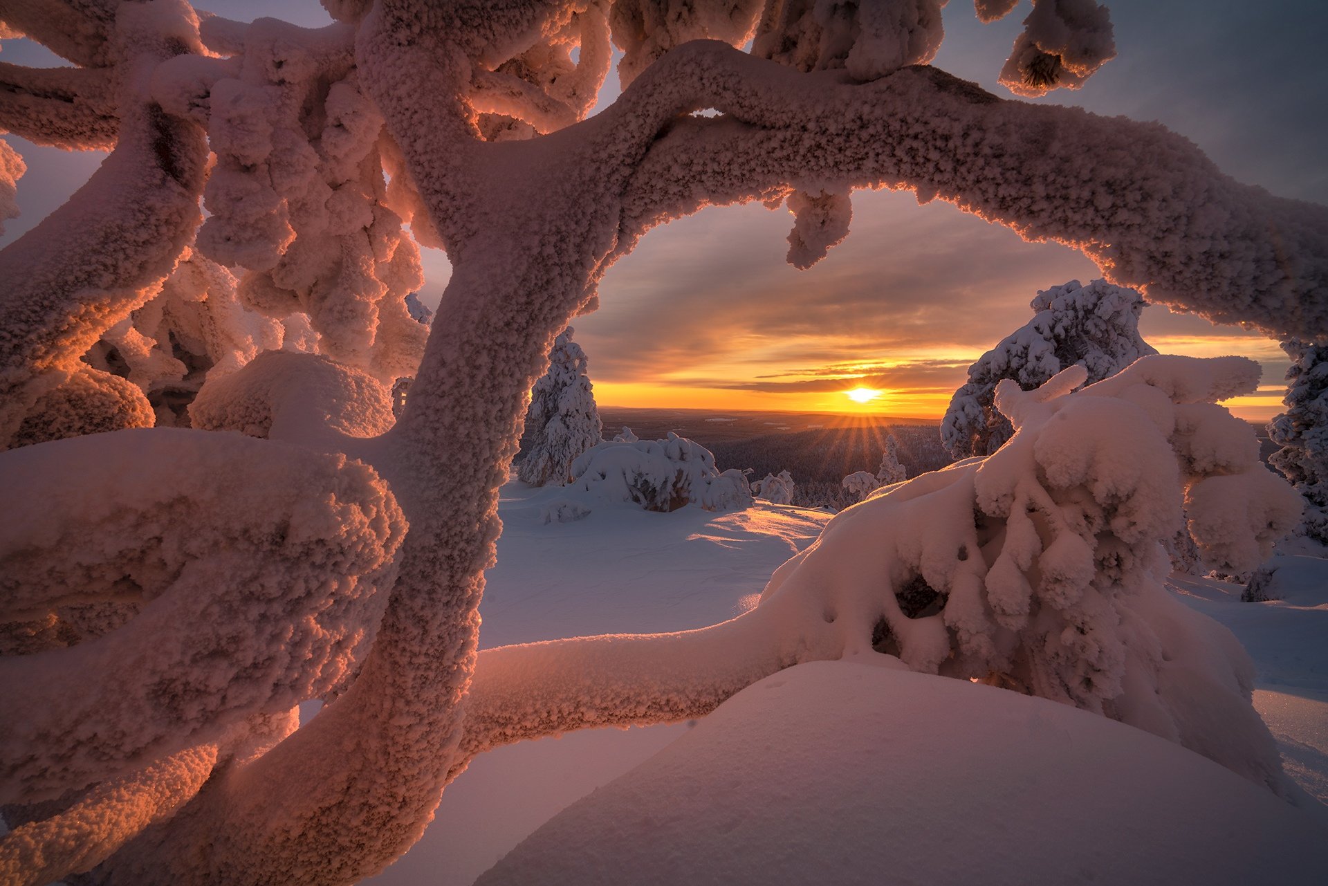 Многие считают, что в Заполярье очень холодно. На самом деле это не так. Да, бывают иногда морозы. Но причина такой дивной красоты вовсе не в морозе, а во влажности. Именно 100% ежедневная влажность и создает такое заиндевелое чудо. Проникая в каждую трещину, в каждую клетку этих деревьев и растений, обволакивает их и погружает в зимний сон.