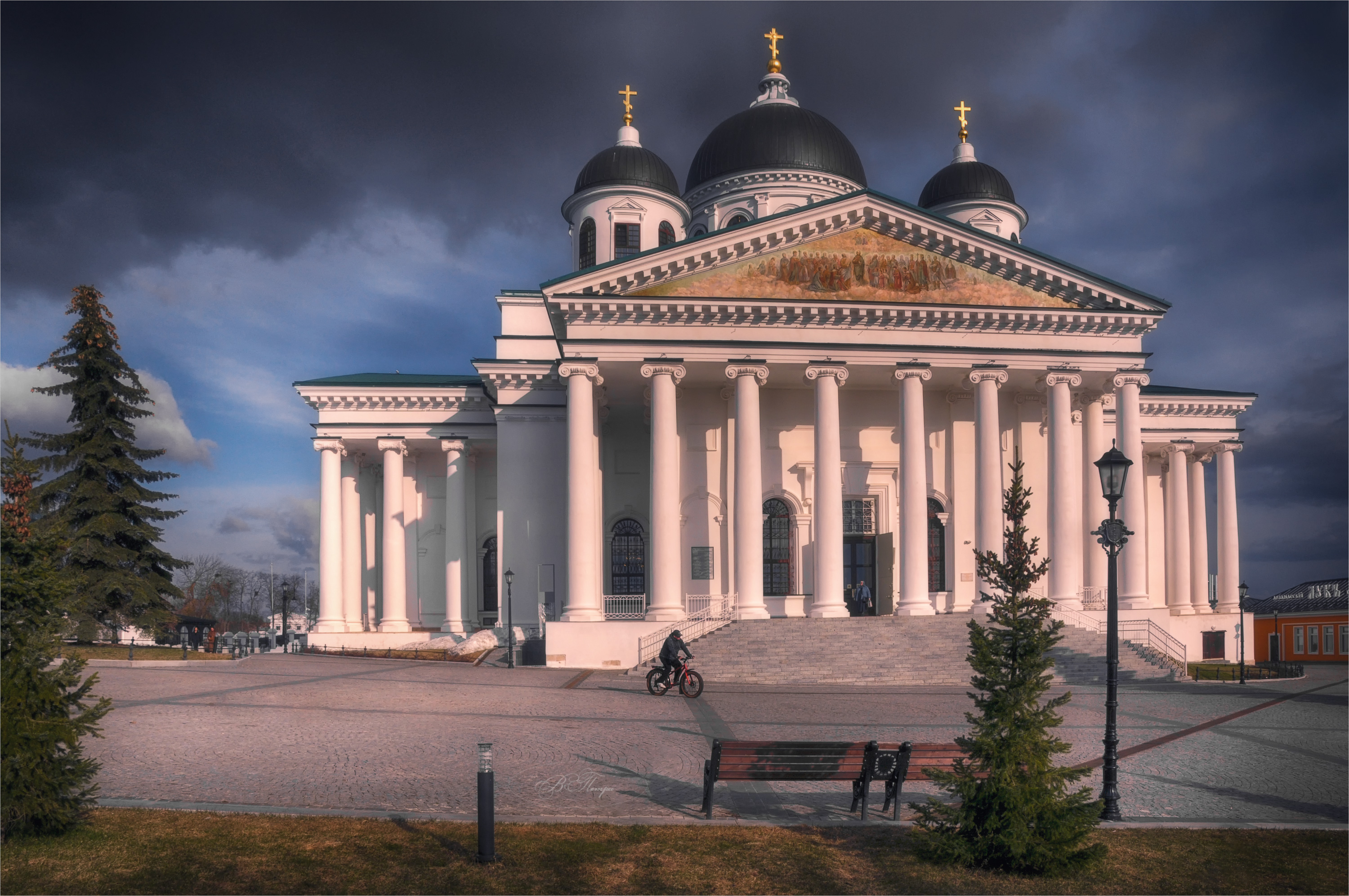 собор, колонны, велосипедист, облака, Вера Петри