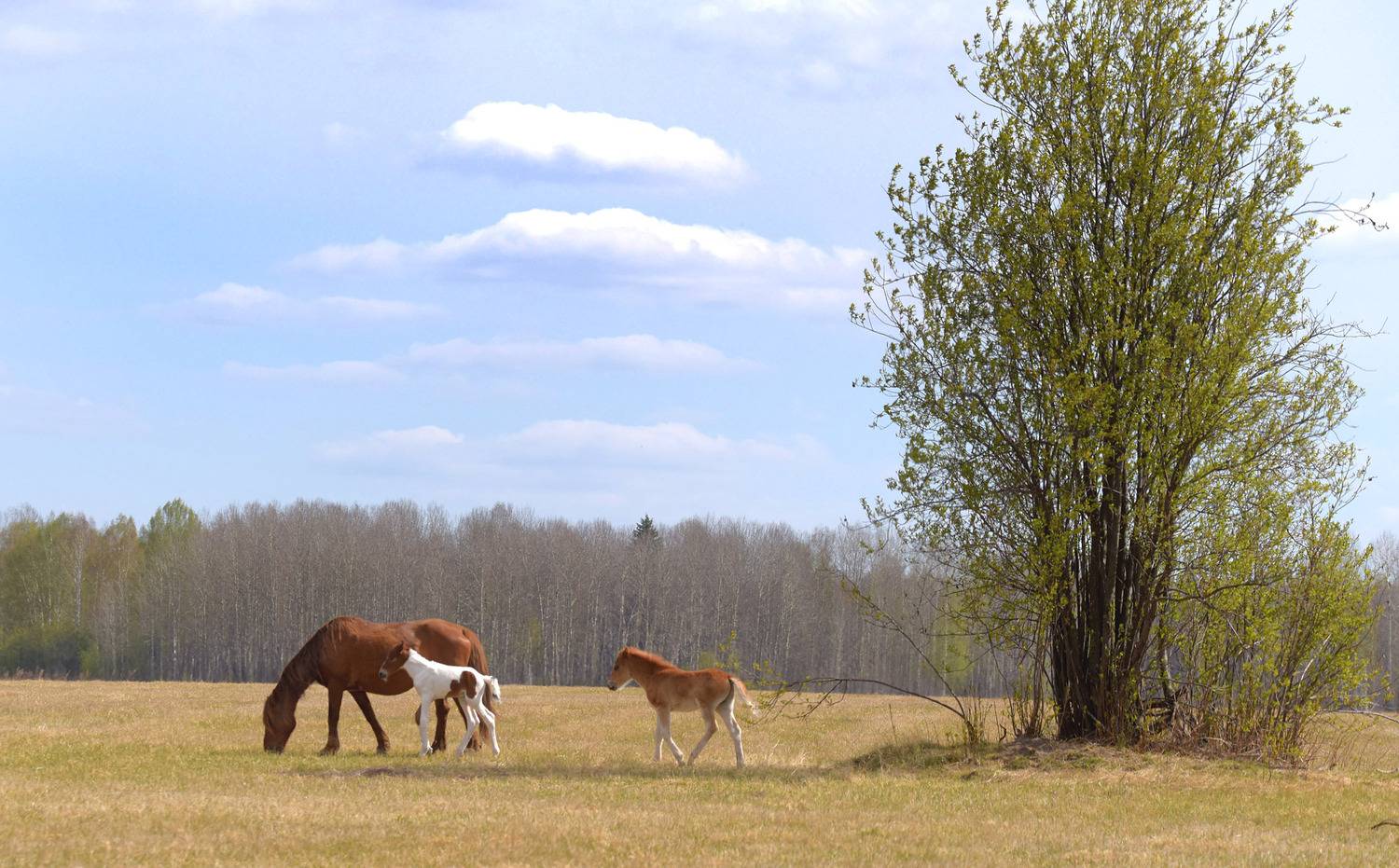 жеребятазелёная травкакобыла-мамапасущиеся лошадивесенний луг