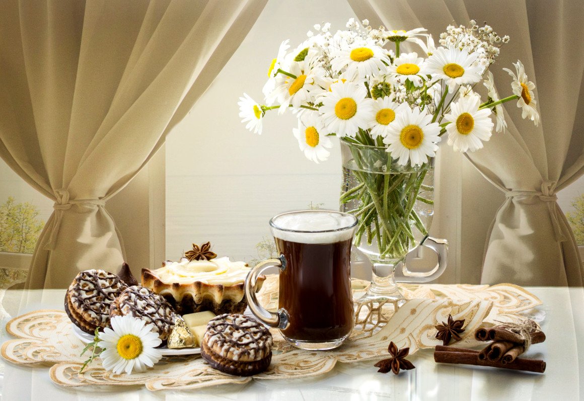 утро, натюрморт, кофе, печенье, букет, ромашки, Шруб (Беляева) Татьяна
