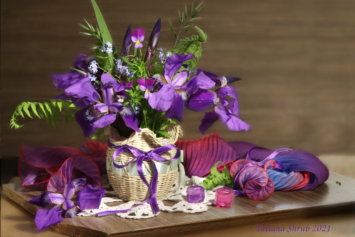 натюрморт, букет, ирисы, корзинка, шарф, Шруб (Беляева) Татьяна