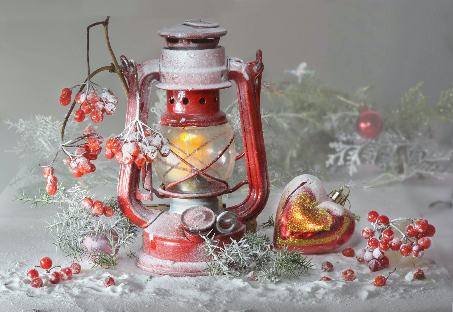 натюрморт.  фонарь игрушки праздник новый год ветки калина, Шруб (Беляева) Татьяна