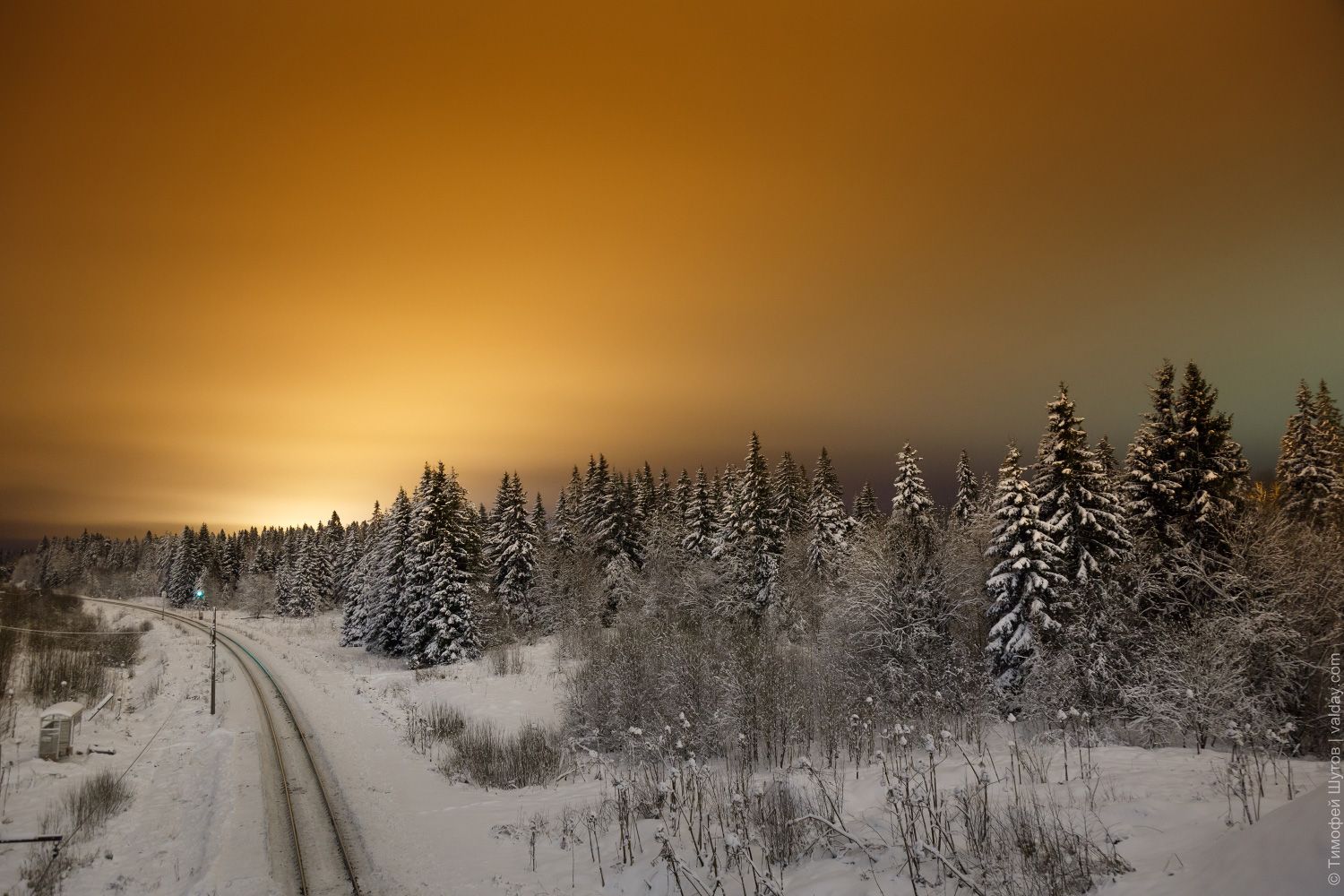 Валдайская тайга, Бологое-Псковская железная дорога и жёлтое от огней автодороги Москва — Санкт-Петербург небо.
